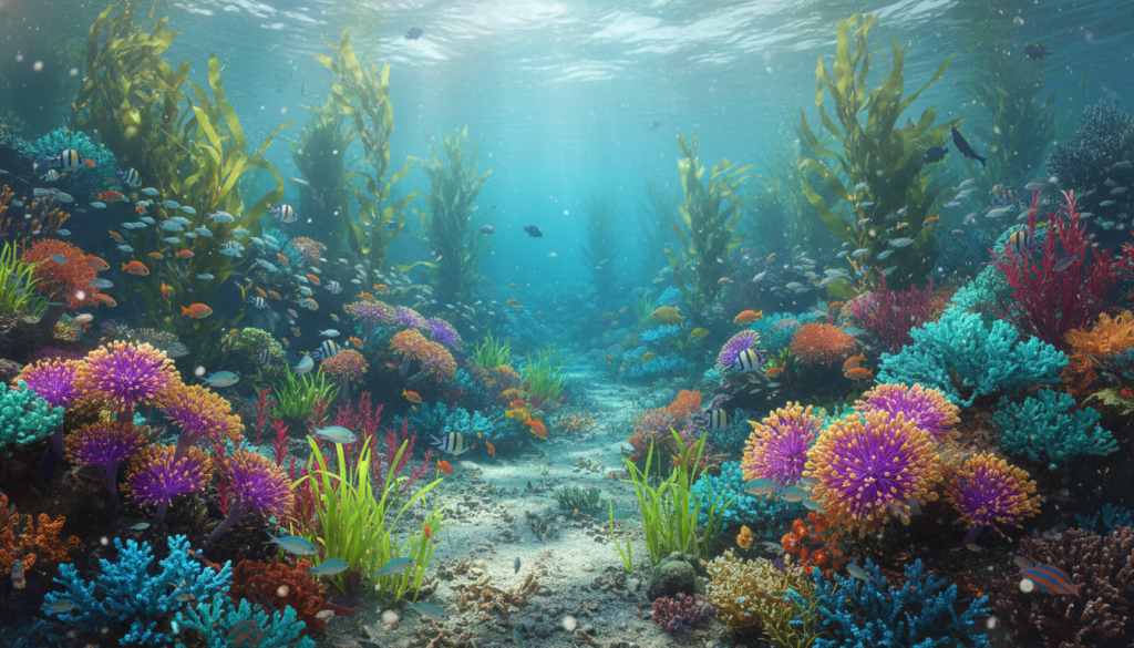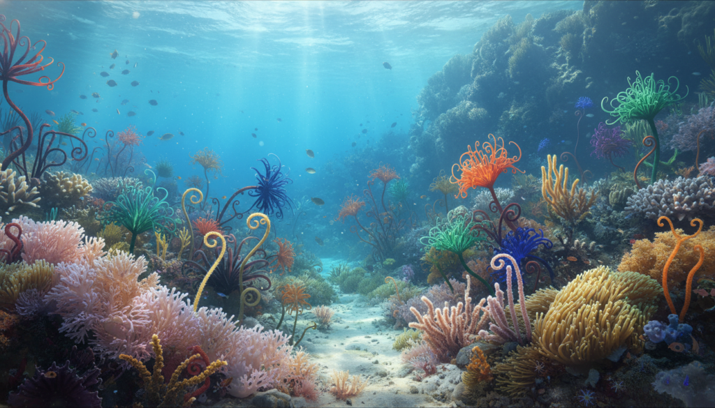 Exploring the ocean’s depths, you might see colorful clusters of aquatic flowers. These are called marine flowerbeds. They grow in dark places, getting nutrients from their surroundings. Their bright colors create lively homes for many creatures, helping keep the ocean stable.